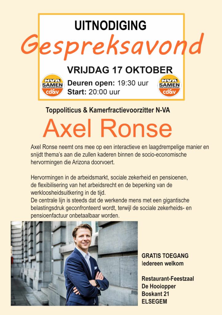 Uitnodiging gespreksavond 17 oktober Axel Ronse, Kamerfractievoorzitter NV-A en toppoliticus...